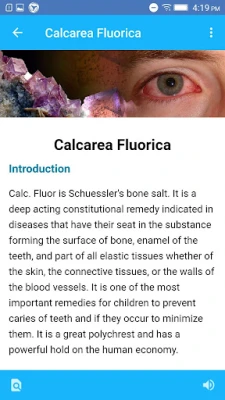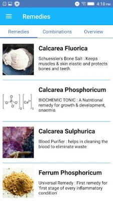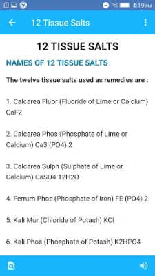 Biochemic Tissue Salts mobile app is an easy to use app which provides details on 12 tissue salts covering its Introduction, Common Name, Preparation, Ailments from, Constitution, Miasms, Key Symptoms, Mind Symptoms, Modalities, Clinical conditions, Therapeutics, Self Assessing Questions in details. It is a handy tool to learn Biochemic Cell Salts in details and apply them in your practice.